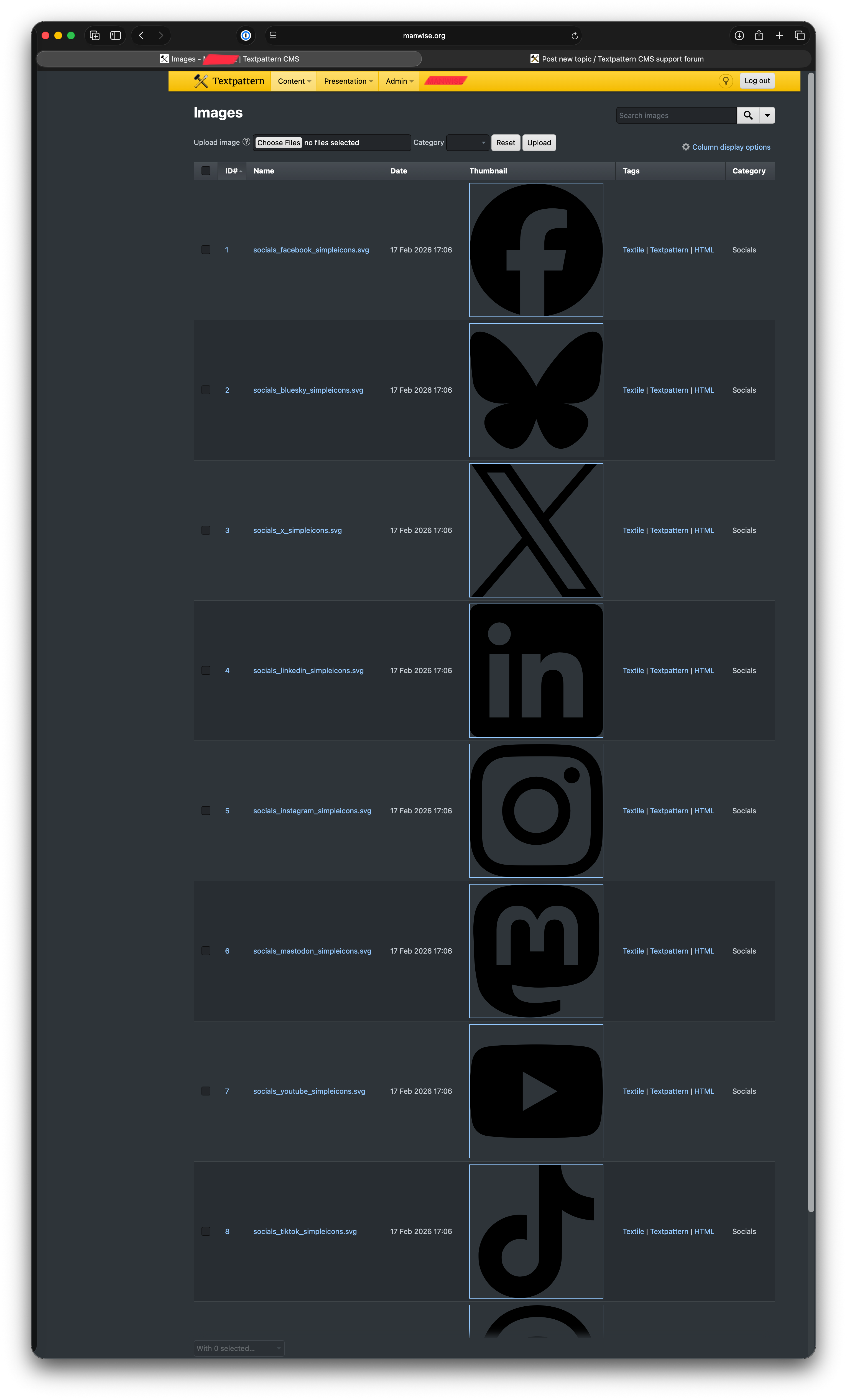Technicals: Textpattern 4.9.1, all images managed by admin side are SVG with a native size of 24×24.